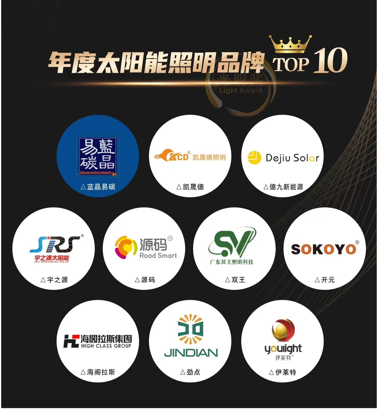江蘇開元照明集團(tuán),以高人氣高口碑光榮登榜,獲得“太陽(yáng)能照明品牌TOP10”。