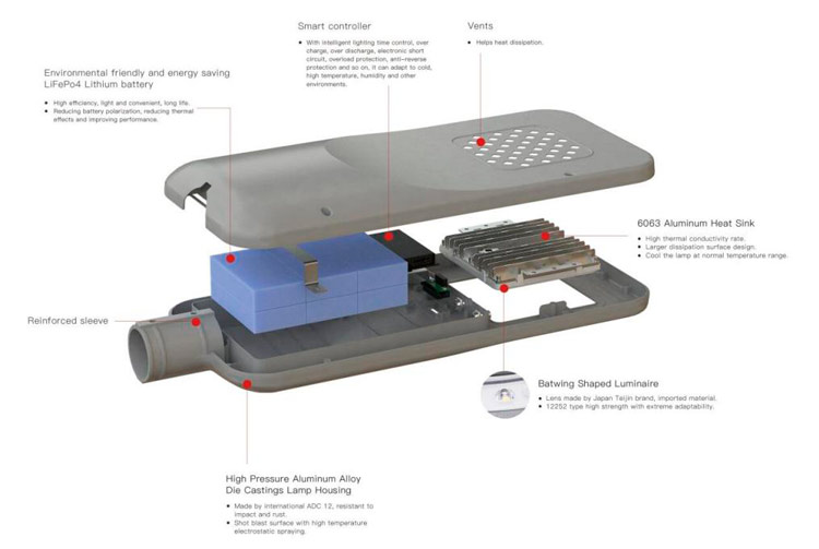 金星二合一太陽(yáng)能路燈采用高效LED模塊、防水燈殼、長(zhǎng)壽命鋰電池和智能太陽(yáng)能充電控制器。